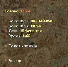 Инструкция: Для начала нужно зарегестрировать свою команду, для этого открываем консоль и вписываем: reg_team "Название команды" "Имя капитана" "Связь", после того как зарегестрировали команду вводим в чате: /request или в консоле: say /request, там выбираем свою команду, команду соперника, число, время, ну вобщем сами разберётесь, всё на русском.