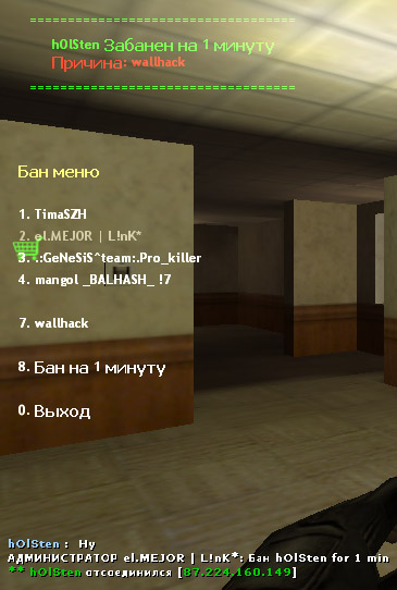 amx_reasons - установить возможние причины бана в меню Использование: amx_reasons <причина 1> <причина 2> [причина 3] ... ------------------------------------------------------------------------------------- Пример: amx_reasons "cheat" "" "wallhack" "noob" "mnogo govoriw" Нотатки: с целью умению использование CPU число причин ограничего до 24. Используй значение "" для добавления бана без причины. Запиши список ваших причин в файл файл amxx.cfg... также зделай и с amx_times...